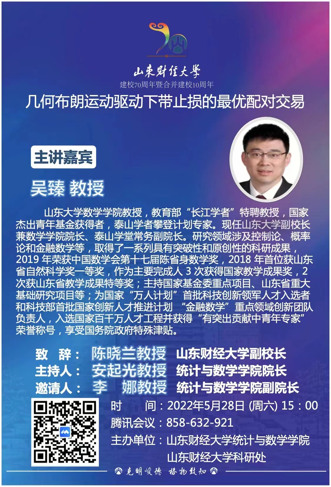 吴臻,山东大学数学学院教授,教育部“长江学者”特聘教授,国家杰出青年基金获得者,泰山学者攀登计划专家。现任山东大学副校长兼数学学院院长、泰山学堂常务副院长。担任国家自然科学基金数学天元基金学术领导小组成员,山东数学会理事长,国际控制理论权威期刊SIAM Journal on Control and Optimization、国家基金委英文期刊Fundamental Research数学物理领域编委、SCI学术期刊Statistics & Probability Letters、国际学术期刊Probability, Uncertainty and Quantitative Risk、Partial Differential Equations and Applications编委。研究领域涉及控制论、概率论和金融数学等,取得了一系列具有突破性和原创性的科研成果,2019年荣获中国数学会第十七届陈省身数学奖,2018年首位获山东省自然科学奖一等奖,作为主要完成人3次获得国家教学成果奖,2次获山东省教学成果特等奖。主持国家基金委重点项目、山东省重大基础研究项目等。为国家“万人计划”首批科技创新领军人才入选者和科技部首批国家创新人才推进计划“金融数学”重点领域创新团队负责人,入选国家百千万人才工程并获得“有突出贡献中青年专家”荣誉称号,享受国务院政府特殊津贴。