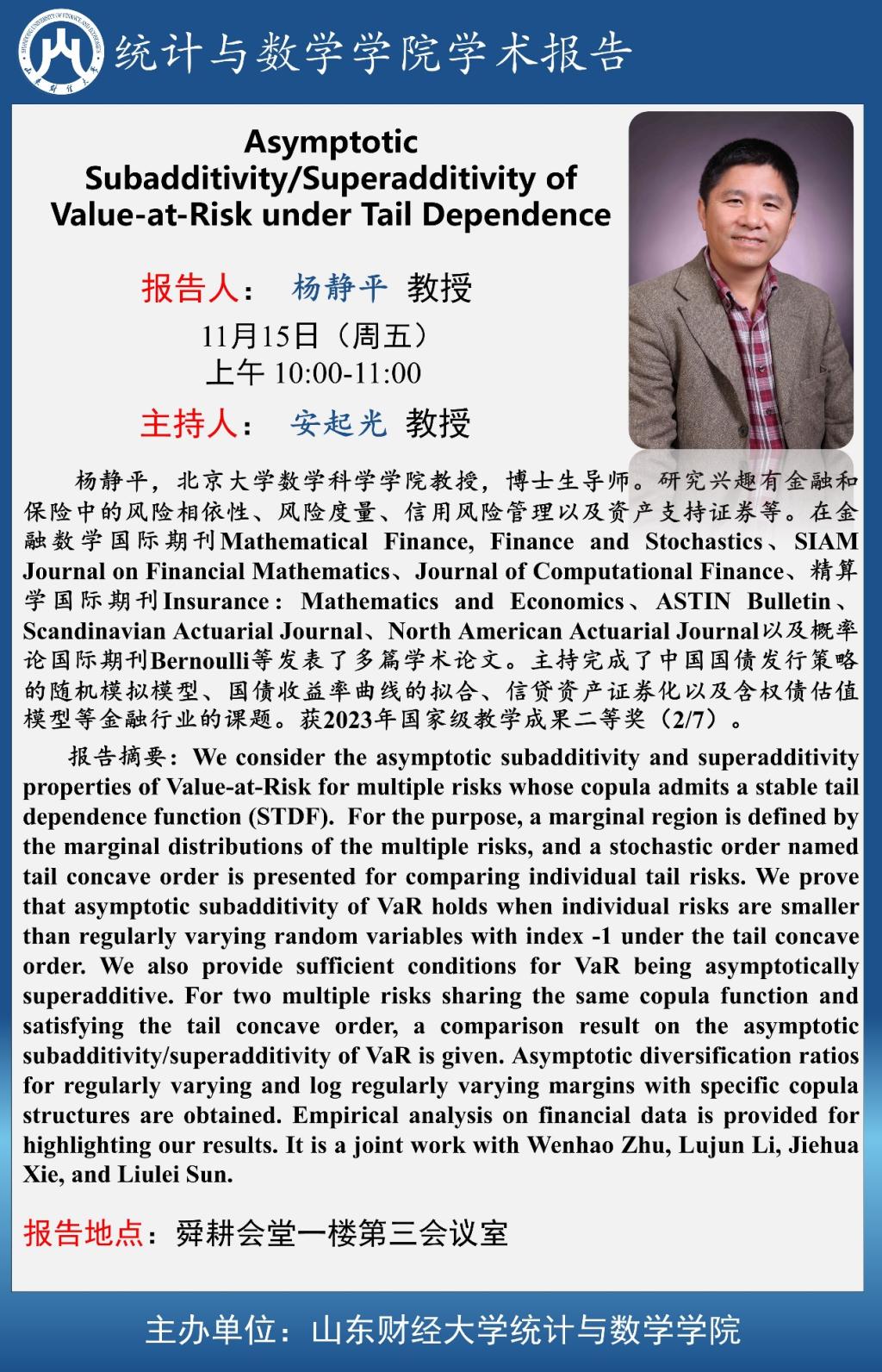 成人网 学术预告—Asymptotic Subadditivity/Superadditivity of Value-at-Risk under Tail Dependence