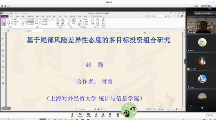 第二位报告人是上海对外经贸大学赵霞教授。赵霞教授是理学博士,应用经济学博士后,北卡罗来纳大学和滑铁卢大学访问学者,曾担任成人网 统计学院副院长、博士生导师。研究方向为风险管理与精算、金融统计。主持国家自然科学基金面上项目2项、教育部人文社科项目2项,在国内外重要学术期刊发表学术论文40余篇,5项研究成果曾获得省部级奖励。赵教授报告的题目是《基于尾部风险差异性态度的多目标投资组合优化》,报告对峰度系数进行调整用以刻画资产收益率左尾的厚度,并以此为聚类特征,运用K-Means方法把资产划分为若干个资产组。在此基础上,考虑投资者对于不同类别资产组的尾部极端风险所持有的不同态度,利用逐步优化的思想提出了两类均值-方差-多置信水平CVaR优化模型,并进行模拟和实证分析。从尾部风险态度、优化模型、目标收益率、投资者风险偏好等多角度对比分析,研究对最优策略的影响。研究表明:在达到相同目标收益的条件下,新的模型通过减小总的投资比例,减小了投资组合的风险暴露,且能够更好的控制风险,投资策略具有更稳定的外样本表现。