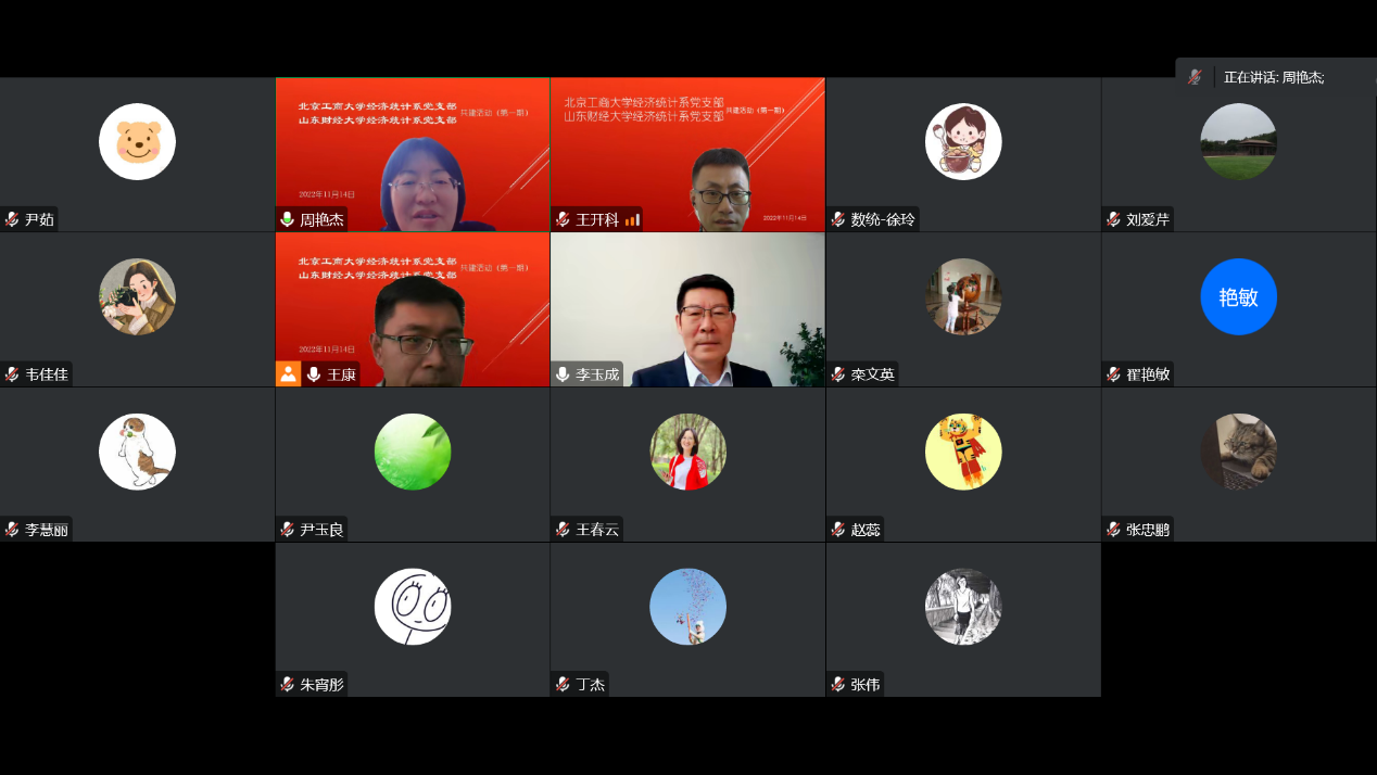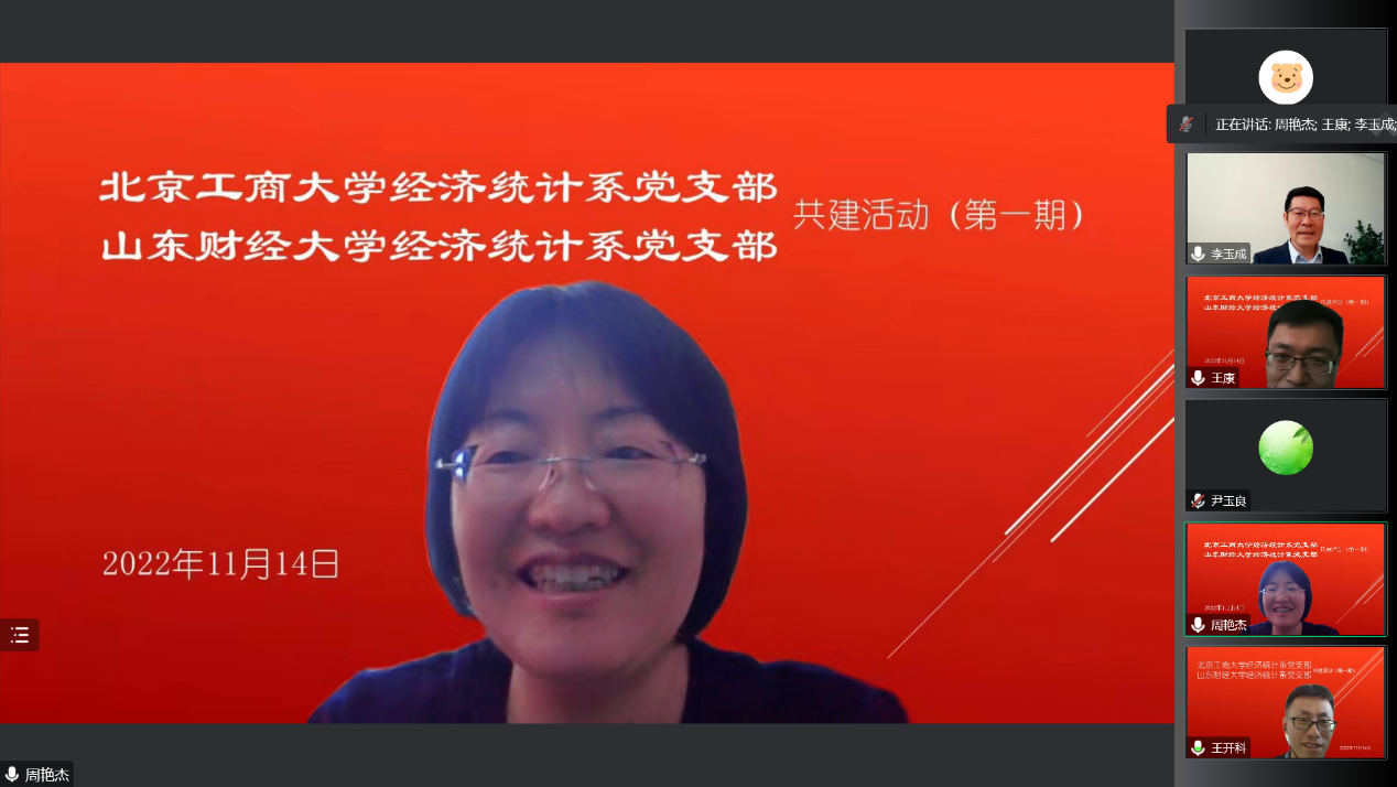 成人网 党委书记李玉成、北京工商大学数学与统计学院党委书记周艳杰,以及两校经济统计系支部的党员教师和部分研究生代表参加线上交流,活动由北京工商大学经济统计系主任王康主持。