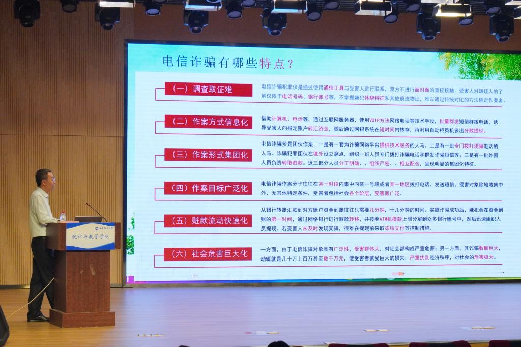 本期第二场讲座由李为举带来“未雨绸缪多防范,有备无患保平安”为主题的安全教育专题讲座。讲座伊始,李为举便指出安全是底线,形象地将安全比作木桶的底板来说明安全的重要性,并着重从防范电信诈骗、消防安全两个方面进行讲解。对于电信诈骗,他结合真实案例说明什么是电信诈骗及其特点,教导同学们识别电信诈骗的方法和防范措施,并呼吁同学们下载国家反诈APP,发现被骗后要及时报警;随后,李为举分别从警示篇、防火篇、灭火篇、逃生篇等四个篇章对消防安全进行讲解,他列出发生火灾的数据来说明不当使用电器和随地扔烟头的危害,并强调学会使用灭火器、消防栓和组织逃生演练的重要性与必要性。讲座最后,李为举提醒同学们在突发事件中要学会正确处理,自觉树立安全防范意识,保护人身财产安全。