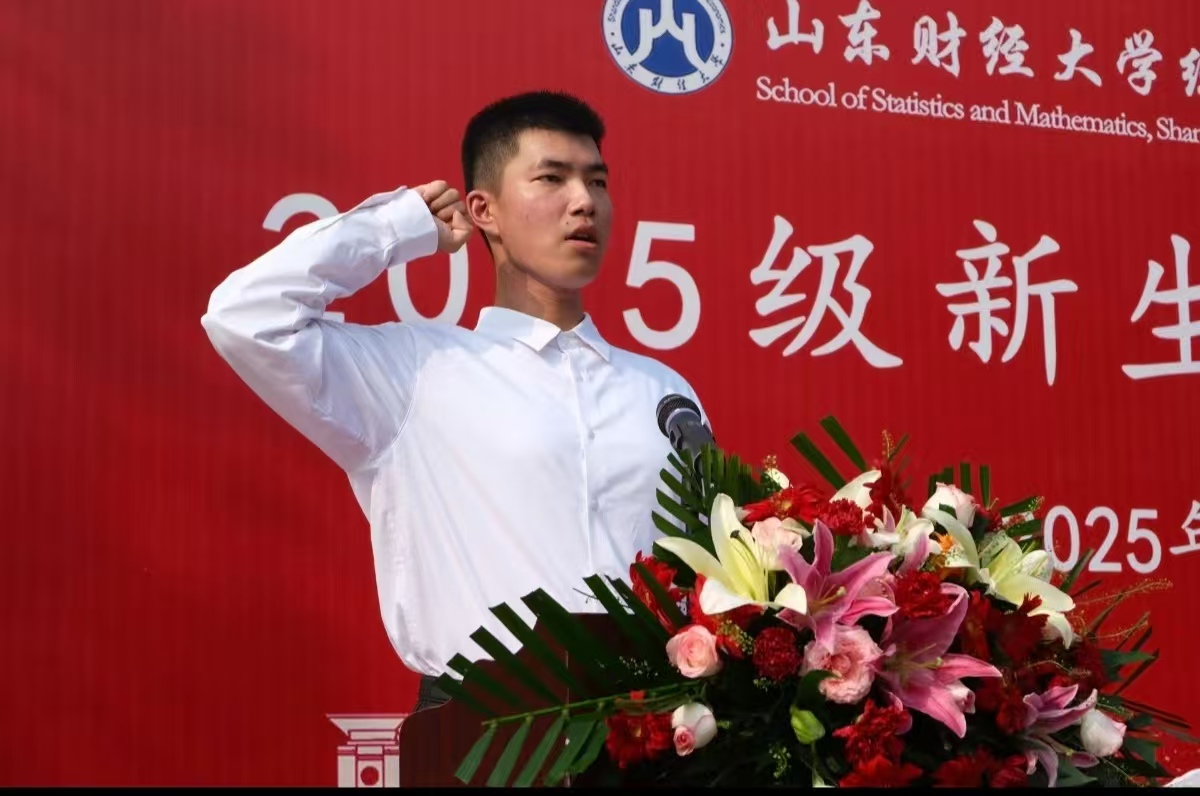 典礼最后,2025级数据科学与大数据技术3班赵一诺带领全体新生庄严宣誓,誓言恪守校训、勤学笃行。铿锵誓言回荡会场,彰显统数学子昂扬向上的精神风貌与奋发有为的坚定决心。