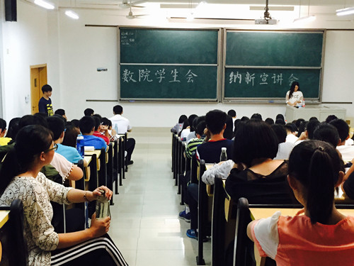 圣井校区数学与数量经济学院于B2111教室开展了数院学生会纳新宣讲会,大一新生代表、大二学生会代表以及大三主席团即学生会各部门部长参与会议。