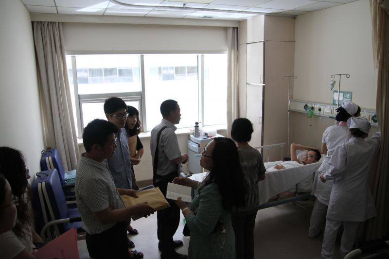 在医院探望期间,赵连幸向吕国昌同学及其亲属转达了学院其他领导及全体同学的亲切问候,询问吕国昌同学近期治疗康复情况,鼓励他安心养病,战胜病魔。随后,赵连幸把募捐的财物交予吕国昌家人,并由学生党员代表向吕国昌同学转达了成人网