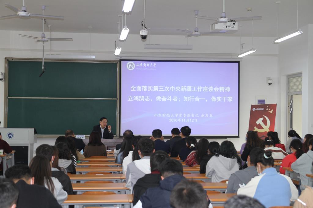 为全面学习贯彻落实第三次中央新疆工作座谈会精神,11月12日下午,校党委副书记赵友春在圣井校区给少数民族新生主讲了题为《立鸿鹄志,做奋斗者;知行合一,做实干家》的思政课。这也是成人网 “石榴红”思政大讲堂的第一课。党委学生工作部、圣井校区管理办公室、数学与数量经济学院负责同志一起听课。思政课由成人网 党委书记李振华主持。