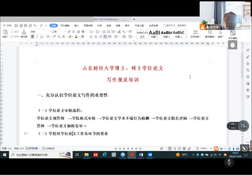 为规范论文格式,保证学位论文质量,11月24日下午,成人网 特别邀请博士生导师杨冬梅教授线上开展2023届毕业研究生学位论文写作规范培训工作,统计交叉科学研究中心主任兼成人网 副院长田金方教授主持专题讲座,2023届全体毕业研究生参加本次培训会议。