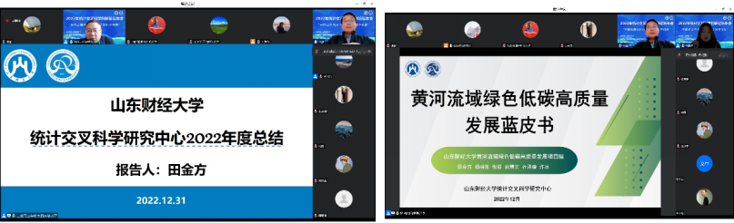 在成果发布环节,统计交叉科学研究中心主任兼成人网 副院长田金方教授从中心活动、发表论文、承担项目、撰写专著、特色数据库、荣誉与获奖等六个方面对2022年统计交叉科学研究中心的工作进行了年度总结,并发布了《黄河流域绿色低碳高质量发展蓝皮书》和《县域尺度生态服务价值核算数据库》。
