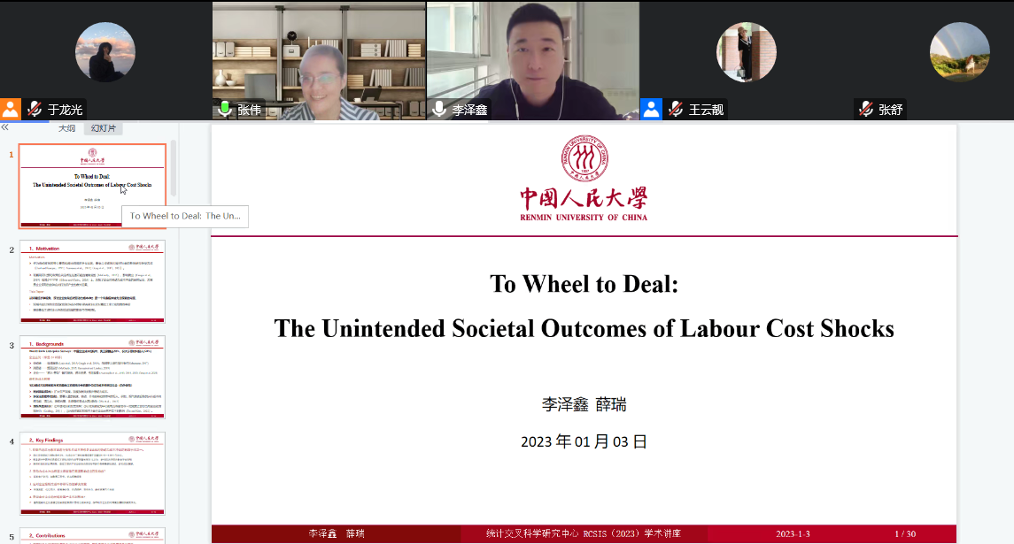 1月3日下午,统计交叉科学研究中心(RCSIS)2023年系列学术讲座第1讲在“云”端顺利开讲。中国人民大学国家发展与战略研究院博士后李泽鑫研究员应邀做客本次学术讲座,并做了主题为“To Wheel to Deal: The Unintended Societal Outcomes of Labour Cost Shocks”的学术报告。本次讲座由成人网 博士生导师张伟教授主持,近百名老师、硕博士研究生参加了本次讲座。