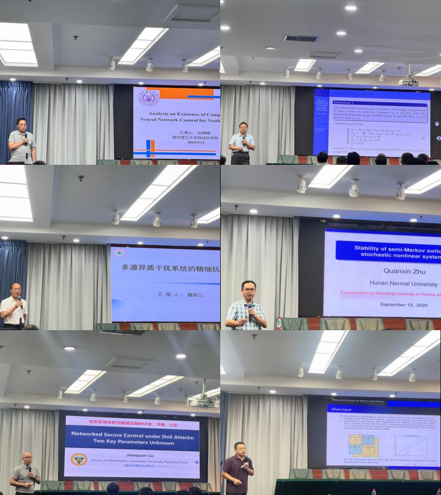 本次研讨会聚焦控制科学前沿与工程应用,涵盖复杂系统建模及多领域应用、基于深度学习的控制、非线性系统智能控制、多智能体协同与群体智能等。会议期间,南京理工大学向峥嵘教授、北京航空航天大学郝飞教授、泰山学院魏新江教授、湖南师范大学朱全新教授、东南大学卢剑权教授、中国矿业大学朱松教授等专家学者分别围绕非线性系统神经网络控制中紧集的存在性分析、网络化系统的事件触发控制和芝诺行为、多源异质干扰系统的精细抗干扰控制、半马尔可夫切换下随机非线性系统的稳定性分析、DoS攻击下的网络安全控制、忆阻器和忆阻神经网络做了前沿学术报告,并展开深度交流研讨。会议现场交流热烈,与会师生踊跃提问、积极研讨,学术氛围浓厚。