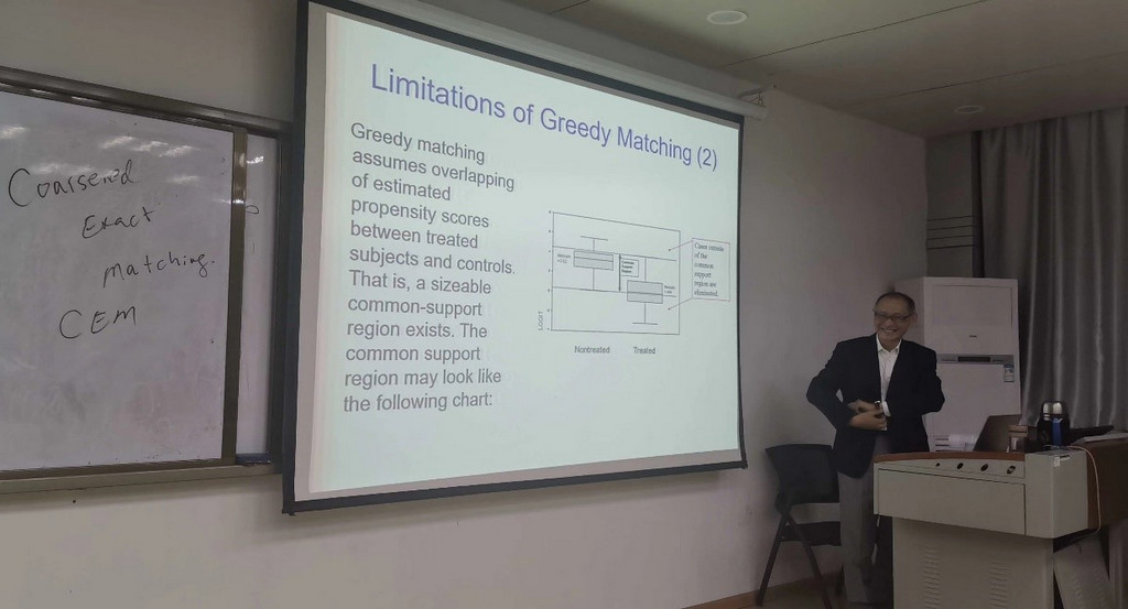在随后两天授课时间里,郭教授分别就倾向值分析方法的历史发展、反事实理论框架及其假定、倾向值匹配原理及相关模型和匹配值估计等当面进行了详细的讲授,并与听课师生进行了热烈交流,解答了师生们关于倾向值分析的诸多提问。听课老师和同学们都表示这种短期集中授课方式效果良好,能真正做到听的懂原理、学的会应用!