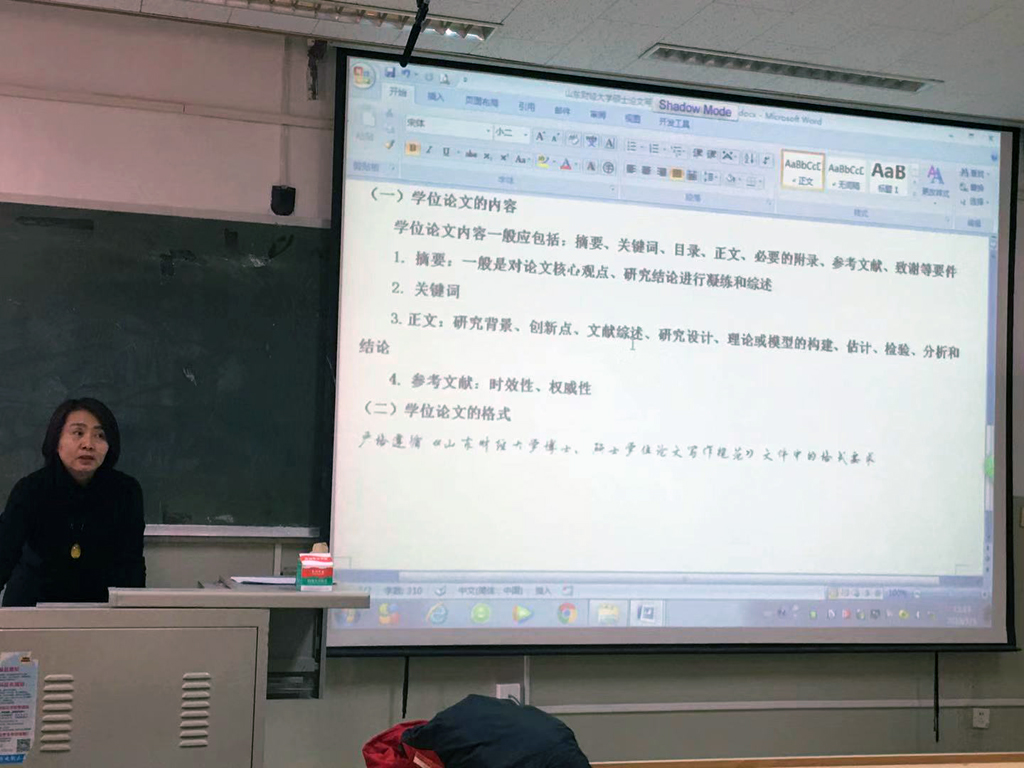 为保证学位论文质量,规范论文格式,按研究生院要求,成人网 于1月3日下午两点在1505举办2019届毕业研究生学位论文写作规范培训讲座,邀请成人网 在学科专业经验丰富的杨冬梅教授主讲,杨教授详细分析了研究生在论文写作过程中论文规范方面需要注意的问题及事项,并与学生一起学习了与学位申请相关的文件,让学生知悉学术不端行为检测、论文隐名评阅、论文答辩、论文抽审等学位申请环节的文件规定。