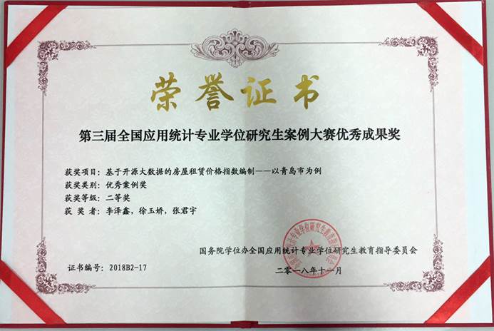 11月9日至11日,由国务院学位办全国应用统计专业学位研究生教育指导委员会(以下简称“教指委”)主办、中国统计教育学会高等教育分会主办,兰州财经大学统计学院承办的第三届全国应用统计专业学位研究生案例大赛颁奖典礼及学术交流会在兰州财经大学和平校区举行。2017级应用统计专业学位研究生李泽鑫、徐玉娇和张君宇合作完成的项目案例《基于开源大数据的房屋租赁价格指数编制——以青岛市为例》荣获大赛二等奖,同时作为应用统计专业学位研究生教学参考案例入选优秀案例库进行出版,指导教师田金方教授获得相应级别的研究生教育教学成果奖。