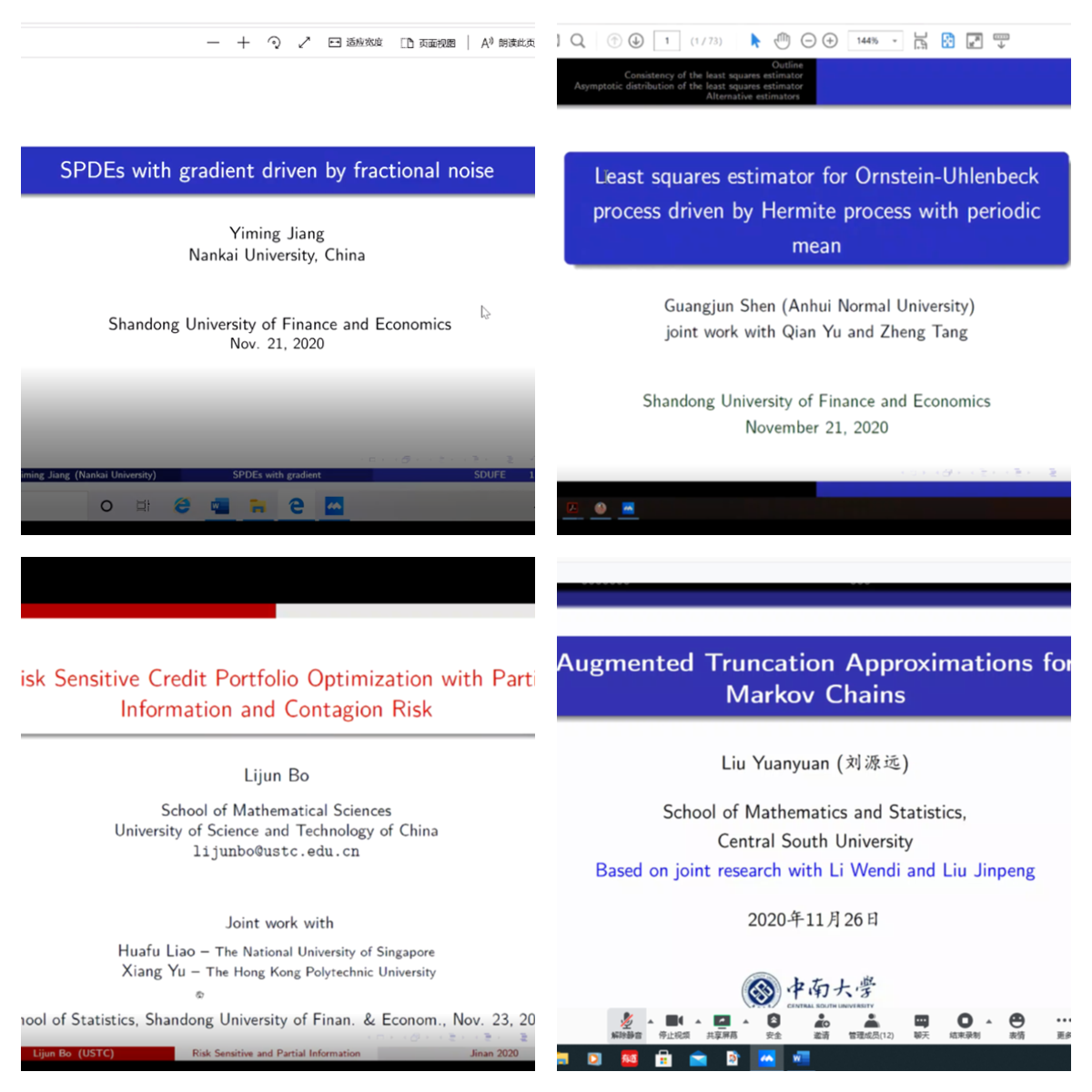 四位学者分别就分数噪声梯度驱动的SPDE、Hermit过程的参数估计、部分信息和传染风险下的风险敏感信贷组合优化以及马氏链平稳分布的截断近似等做了4场精彩报告。各位专家学者参与了系列活动,并与成人网 青年教师和研究生进行了交流。青年教师就学术研究和课题申报等问题与专家学者进行了咨询;研究生们就自己关心的兴趣选题、研究方法以及博士招考等问题,请教了向各位专家。