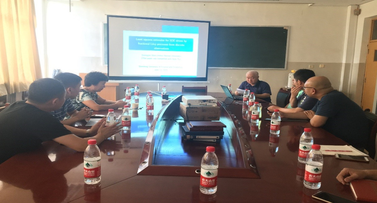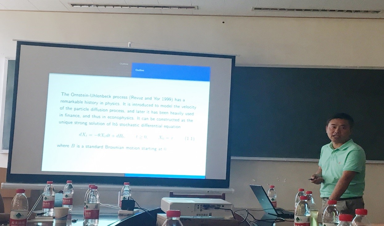 报告伊始,申广君教授以“Least squares estimator for SDE driven by fractional Levy processes from discrete observations”为主题做了精彩报告,申教授的报告深入浅出,基于离散观测对分数Levy噪声驱动的随机微分方程中参数估计问题进行了研究,在漂移函数正则性条件下,证明了最小二乘估计的一致性,同时获得了估计量的渐进形态。