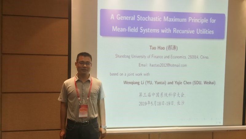 2019年5月18日至19日,成人网 郝涛老师应邀参加在长沙举办的第三届中国系统科学大会,并做题目为“A General Stochastic Maximum Principle for Mean-field Systems with Recursive Utilities ”的报告。大会由上海系统科学研究院主办,国防科技大学承办,中国科学院数学与系统科学研究院系统科学研究所、北京师范大学系统科学学院、北京交通大学交通系统科学与工程研究院、中国船舶工业系统工程研究院、中国系统工程学会、中国自动化学会控制理论专业委员会等单位协办。旨在为系统科学及其相关领域的国内外专家学者提供一个学术交流平台,促进相关学科的交流、发展和融合,促进新方向、新领域的产生。