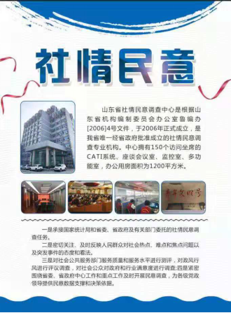 山东省社情民意调查中心是我省唯一经省政府批准成立的社情民意调查专业机构,自2006年成立以来已经完成500余个调查项目,国家统计局和有关委托部门对调查工作给予充分肯定,多项社情民意调查信息被省委省政府采用,刘家义书记、龚正省长多次作出批示。