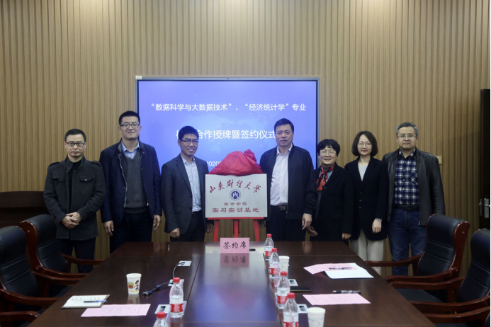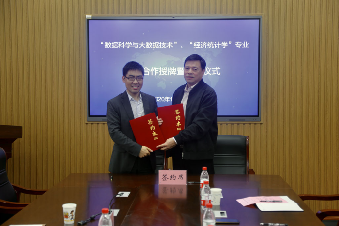 2020年11月18日下午,统计学院“数据科学与大数据技术”“经济统计学”专业校企合作授牌暨签约仪式在学院会议室举行。院党委书记郑磊、副院长裴海峰、院党委副书记许薇、学科竞赛部主任王晓红、实验室主任任文东以及企业方代表上海萌泰数据科技股份有限公司总经理李军、总监张敏参加了签约仪式。仪式由副院长裴海峰主持。
